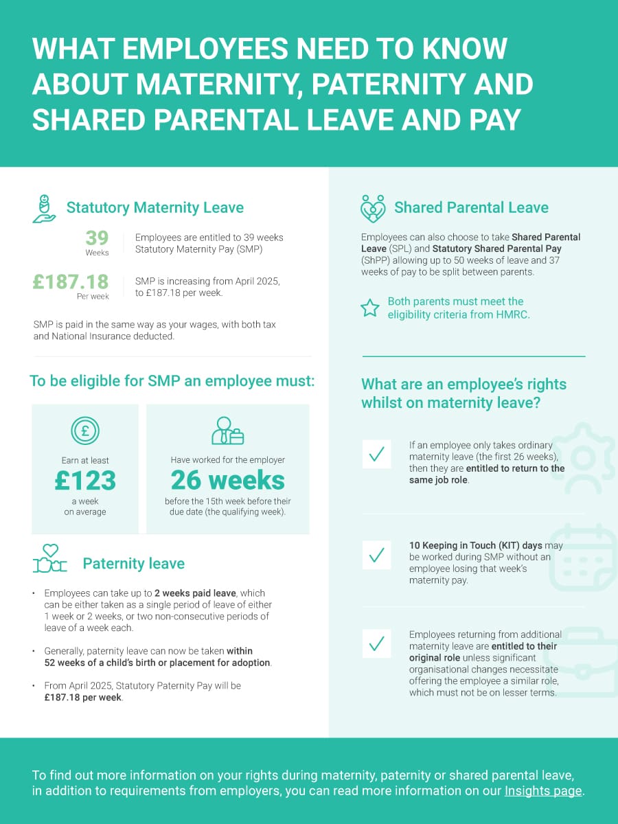 Understanding how maternity, paternity and shared parental leave works is important for both employers and employees. Below, our infographics highlight the key information around leave entitlements, pay rates, and employer responsibilities.